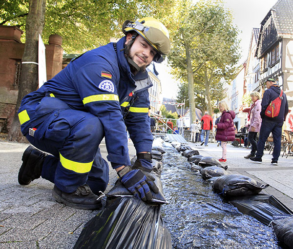 Für die sichere Begrenzung des Bachlaufes, der über 100 Meter duch die Bensheimer Fußgängerzone geleitet wurde, sorgte Claudio Ferlito (Truppenführer THW Bensheim) und seine Kameraden. Foto: soe