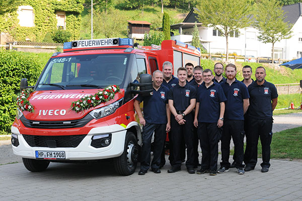 Die aktive Einsatzmannschaft der FFW Hochstädten mit ihrem neuen TSF-W, dessen Tank 750 Liter Wasser fasst. Foto: Eva M. Wicht
