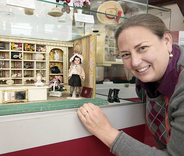 Die erste Vorsitzende des Geschichts- und Museumsvereins Bickenbach Nicole Petendra mit einem alten Kaufmannsladen der Sonderausstellung. Foto: soe