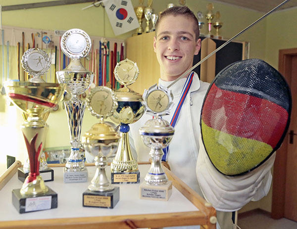 Zahlreiche Medaillen, Preise und Pokale hat der 21-jährige Bickenbacher Peter Bitsch mit seiner Leidenschaft, dem Fechtsport, schon gewonnen, u.a. die Goldmedaille bei der Junioren-WM 2015 in Uspekistan. Foto: soe