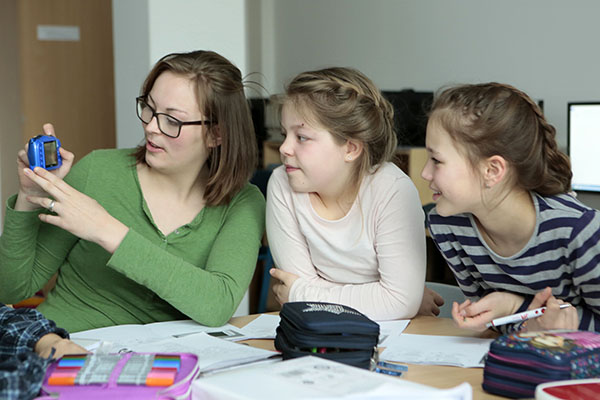 Merle Hunfeld erklärt den neugierigen Schülern den richtigen Umgang mit der Kamera und einem Tablet. Alle müssen einen Kamera- und Tabletführerschein machen. Foto: soe