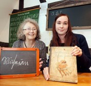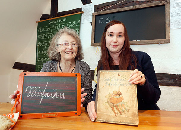 Margit Franz und Isabell Müller hier mit Schultafel und Lesebuch in einem Schulzimmer aus der Zeit um die Jahrhundertwende. Foto: soe