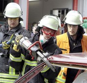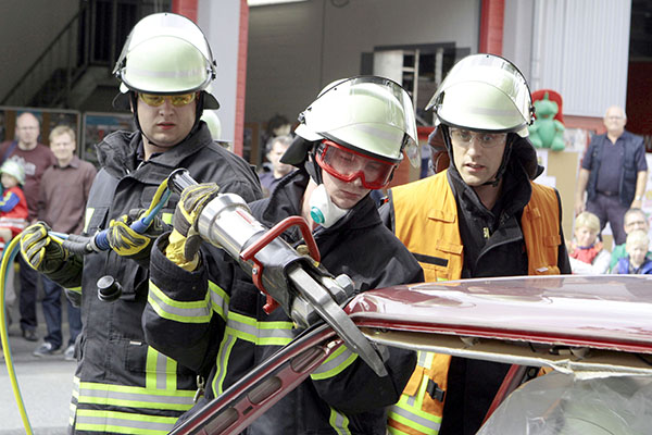 Die Einsatzabteilung demonstrierte den Ablauf einer Rettung einer im Auto eingeklemmten Person mit hydraulischen Rettungsgeräten. Foto: Stefan Oelsner