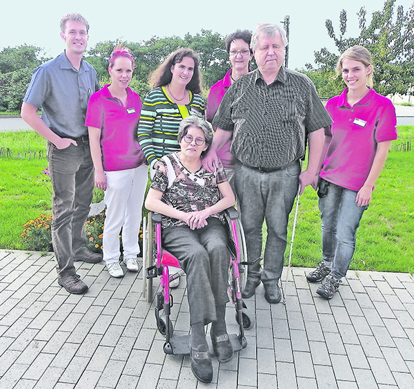 Frau R* freut sich gemeinsam mit Ehemann und Pflegekräften des Seniorenzentrums Bergstraße über ihre Genesung.