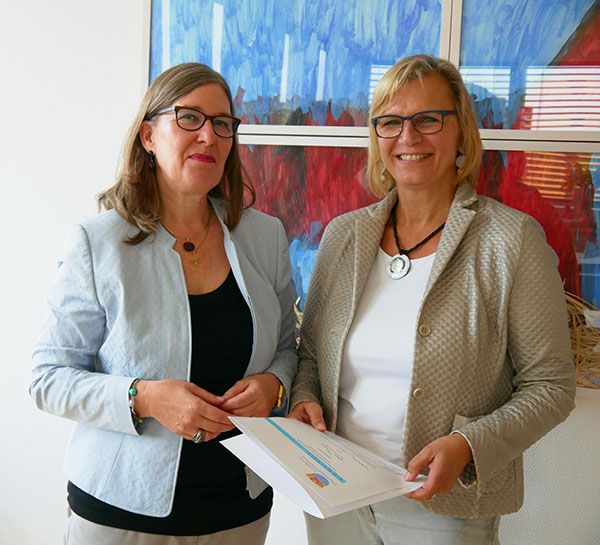 Sozial- und Jugenddezernentin Rosemarie Lück gratuliert Sabine Hahn (li) zum Dienstjubiläum.