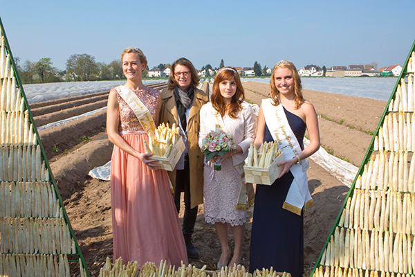 In diesem Jahr wurde Meta I. von Landwirtschaftsministerin Priska Hinz (2.v.li.) zur 20. Spargelkönigin auf den Feldern des Spargelbauern Mager gekrönt. Foto: D. Zengel