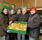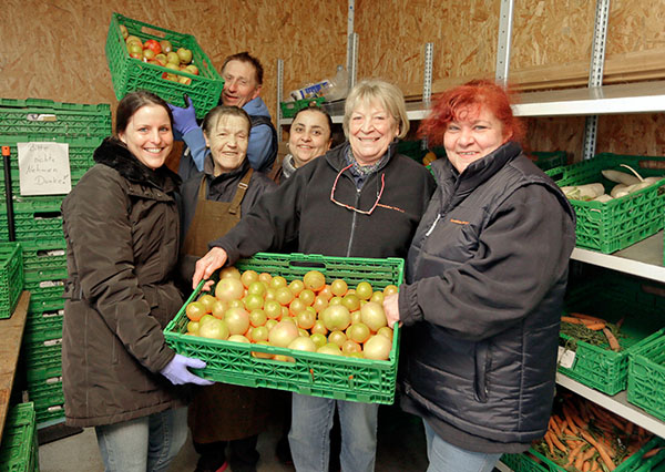 Im Gemüsehaus finden die Tafel-Kunden frisches Obst und Gemüse für ihren Einkauf. Die freundlichen, ehrenamtlichen Mitarbeiter, rund um die Leiterin Ursula Summer (2.v.re.), stehen ihnen dabei tatkräftig zur Seite. Foto: soe