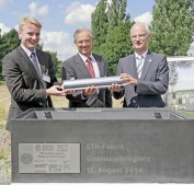Den Grundstein für die neue hochenergieeffiziente Modellfabrik „ ETA-Fabrik“ der TU Darmstadt haben (v.l.) Dipl. Wirtschftsingenieur Martin Beck, Projektleiter Prof. Eberhard Abele und der Präsident der TU Darmstadt Prof. Dr. Hans Jürgen Prömel gelegt. Foto: soe