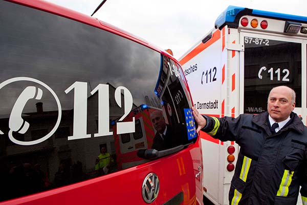Amtsleiter Johann Georg Braxenthaler der Berufsfeuerwehr Darmstadt stattet das Rettungsfahrzeug mit dem markanten Aufkleber 112 aus. Foto: D. Zengel