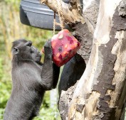 Nicht nur eine willkommene Abkühlung, auch eine interessante Beschäftigung stellen die gefrorenen Leckerbissen für die Schopfmakaken dar, mit denen man sich eine ganze Zeit beschäftigen kann. Foto: Stefan Oelsner