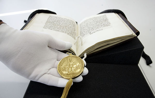 Aufgenommen in das Weltdokumentenerbe „Memory of the World“ wurde die goldenen Bulle Kaiser Karls IV. aus dem 14. Jahrhundert, aus der Sammlung der Universitäts- und Landesbibliothek Darmstadt. Foto: Stefan Oelsner