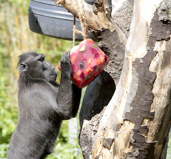 Nicht nur eine willkommene Abkühlung, auch eine interessante Beschäftigung stellen die gefrorenen Leckerbissen für die Schopfmakaken dar, mit denen man sich eine ganze Zeit beschäftigen kann. Foto: Stefan Oelsner