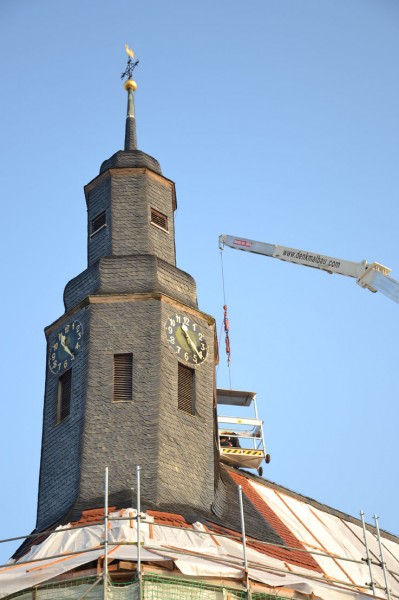 CRUMSTADT, Dezember 2012 (meli), Der Kirchturm der Ev. Kirche Crumstadt wird am Dienstag, den 11. Dezember 2012 kurz vor Weihnachten abgehoben. Seit Frühjahr 2012 wird die Crumstädter Kirche, eine der ersten evangelischen Kirchbauten in Deutschland, bereits grundsaniert. mehr »