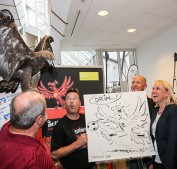 Gruppenbild mit Maskottchen Attila - v.l.n.r. Falkner Norbert Lawitschka, Michael Apitz (Eintracht-Comics), René Lorenz, Heike Dommsch und Rüdiger Starck.