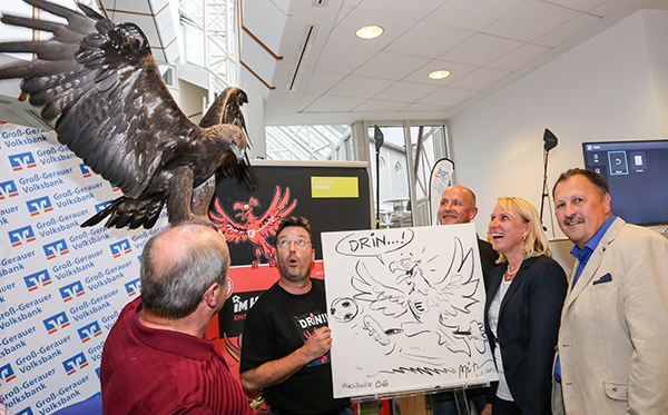 Gruppenbild mit Maskottchen Attila - v.l.n.r. Falkner Norbert Lawitschka, Michael Apitz (Eintracht-Comics), René Lorenz, Heike Dommsch und Rüdiger Starck.
