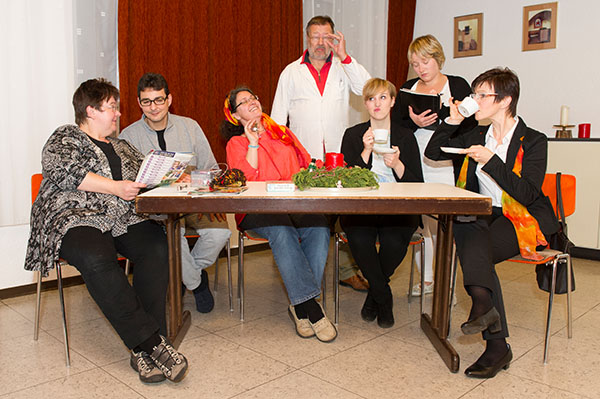 Mit den sehr speziellen Verhaltensweisen der Mitbewohner ihrer Tochter Agnes (Sabrina Florek, mitte sitzend) muss sich Mutter Cecile (Alexandra Sbezzo) bei ihrem Besuch in der offenen Wohngruppe erst noch anfreunden. Foto: soe