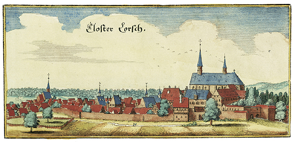 Kolorierter Kupferstich von Matthias Merian d. Ä. vom Kloster Lorsch, Zustand vor 1621. Foto: VSG
