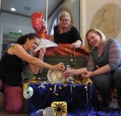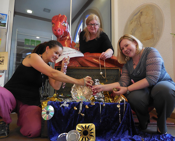 Bewacht vom roten Drachen v.li. die Schatzhüterinnen Jacky Maier, Petra-Marlene Gölz, Mareike Müller.