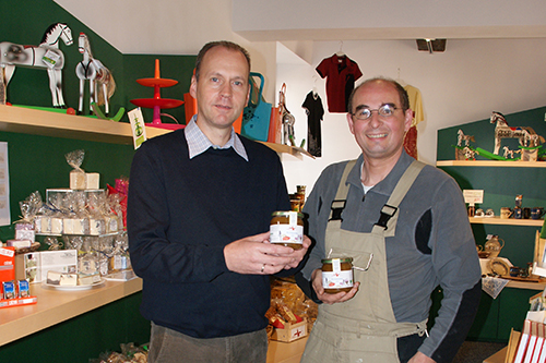 Bioland-Imker Jürgen Parg (re.) übergibt den frisch abgefüllten Erbach-Honig an Frank Reubold (li.), Leiter des Touristik-Zentrums Erbach.