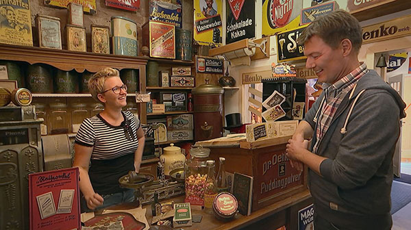 Dieter Voss bei Andrea Heiß in ihrem kleinen Museum für Läden und Reklame. Foto: hr