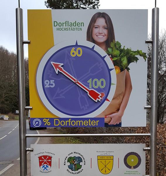 HOCHSTÄDTEN, Dezember 2016 (meli), Seit dem 15. Dezember 2016 besitzt Hochstädten ein Dorfometer. Es befindet sich am Ortseingang von Auerbach kommend. Aber was ist ein Dorfometer? Im Duden und in Wikipedia gibt es dazu keine Einträge. Und dennoch ist es ein wichtiges Instrument: Das Dorfometer in Hochstädten zeigt an, wie viele Anteilsscheine für den neu zu gründenden Dorfladen bisher verkauft sind! mehr »