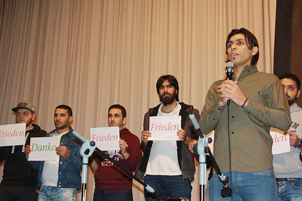 Der Syrer Fawcee Hamouch dankt mit einer Gruppe von Flüchtlingen aus zehn Nationen allen Helfern in der Gemeinde für die Unterstützung und Hilfe.
