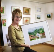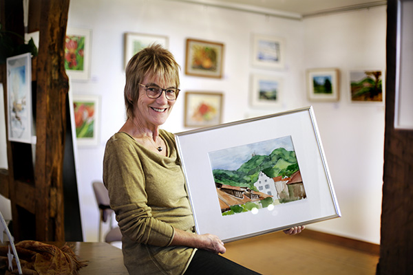 Margarete Reichow, hier mit ihrem eigenen Kunstwerk „Melibokus“, sorgte dafür, dass die 83 Aquarellbilder an den Wänden des Ausstellungsraumes gut zur Geltung kommen.