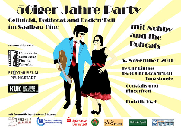 PFUNGSTADT, Oktober 2016 (meli), Der Förderverein Kommunales Kino eV Pfungstadt startet diese Woche den Vorverkauf der Eintrittskarten zur „50iger-Jahre-Party“ am 5.11.2016 im Saalbau-Kino Pfungstadt, Lindenstr. 71. Einlass ist ab 18 Uhr mit einer Übungseinheit „Rock’nRoll“ von und mit der Tanzschule Pfungstadt, anschließend wird gerockt mit Nobby and the Bobcats. Karten gibt es im Vorverkauf zu 15 € einschl. 50iger Jahre-Snack bei M & Z Point, Eberstädter Str. 71, Pfungstadt oder online über www.ztix.de oder an der Kinokasse. Infos unter www.kino-pfungstadt.de