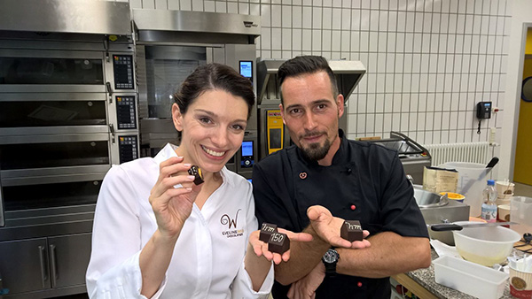 Chocolatier Evelin Wild und Fachlehrer Ralf Stadler bei der Präsentation der Metzendorf-Praline.
