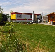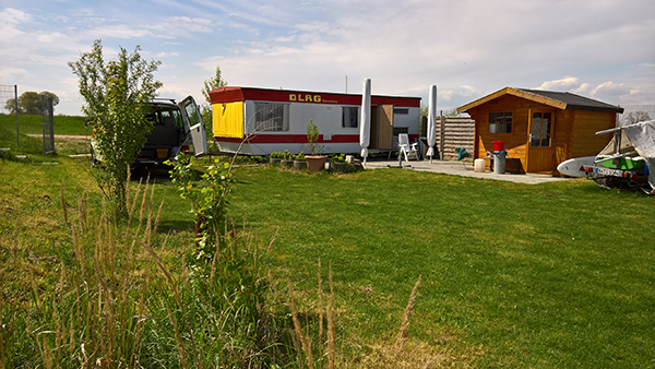 Die Station am See mit Lager-Hütte und Wohnmobilheim.