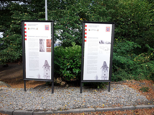 Auf der Burg Frankenstein Schautafeln über die Geschichte der Burg aufgestellt.