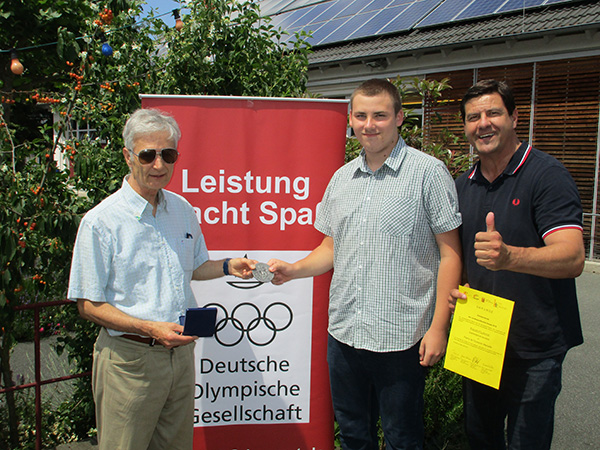 Dr. Müller (li) überreichte Krzysztof Lubinski (mi) die Pierre de Coubertin Medaille. Hannes Marb (re) ist stolz auf seinen Schüler.