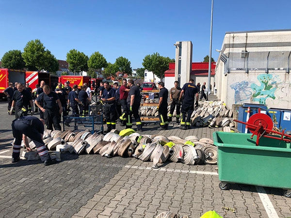 Zirka 90 Schläuche mit einer Gesamtlänge von rund 1.800 m (!) mussten alleine im Seeheimer Aufgabenbereich aufgerollt und sodann an der Sammelstelle am Geräthaus Münster nach Wehrzugehörigkeit sortiert werden. Foto: FF Seeheim
