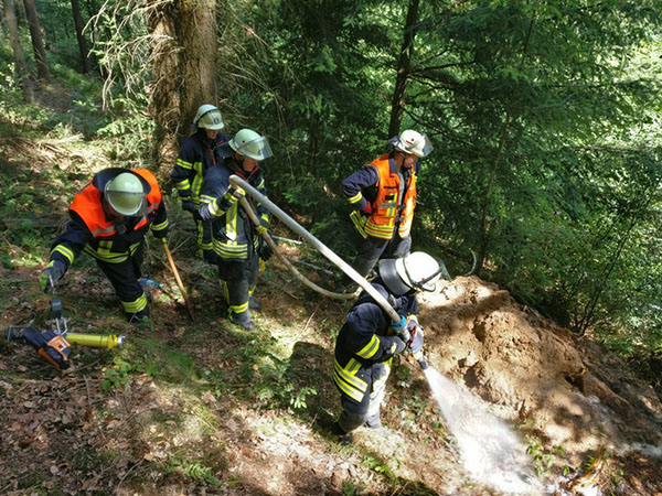 Trotz des steilen und unwegsamen Geländes konnte der Brand gelöscht werden. Foto: FF Seeheim