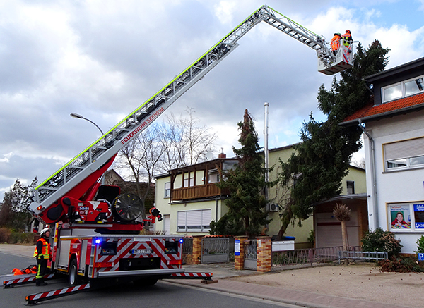 Die Seeheimer Wehr musste mit Hilfe der Drehleiter in der Friedrich-Ebert-Straße eine auf ein Wohnhaus gestürzte Fichte beseitigen. Foto: FF Seeheim