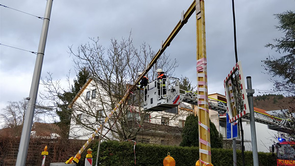 Mit Hilfe der Drehleiter wurde die Stromleitungsbrücke in der Lichtenbergstraße gesichert. Foto: Luc Kumle