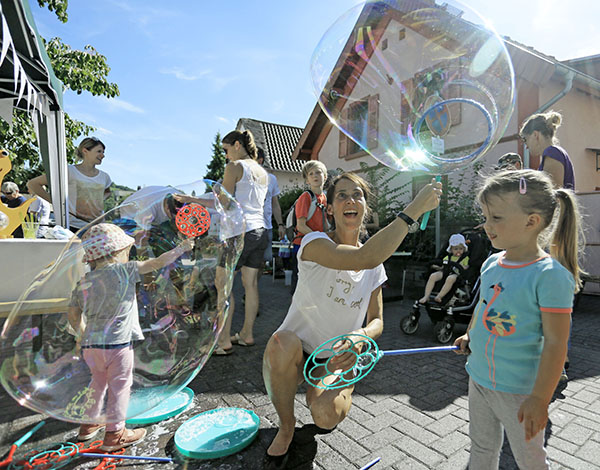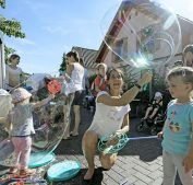 Da staunten nicht nur die kleinen Gäste: Riesige Seifenblasen schwebten am Stand des Frauen- und Familienzentrums SzenenWechsel in die Luft. Foto: soe
