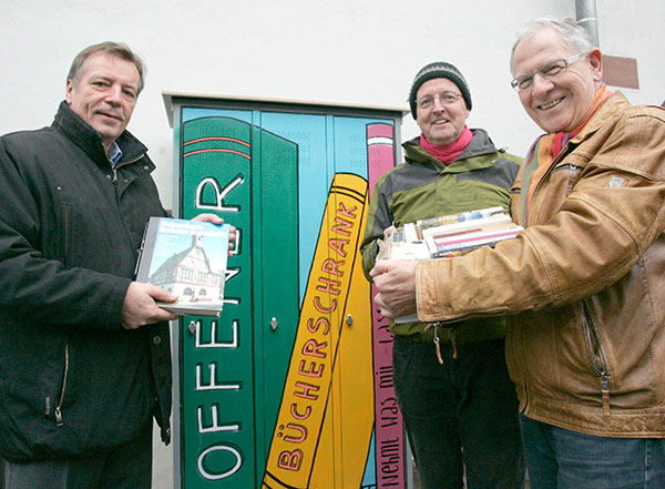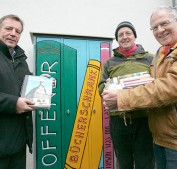 SEEHEIM-JUGENHEIM, Januar 2016 (meli), „Nehmt was mit – lasst was hier“, lautet das Motto und die Inschrift auf dem ersten öffentlichen „Gib- und Nimm-Bücherschrank“ in der Bergstraßengemeinde. Als erstes Buch stellt Bürgermeister Olaf Kühn das Heimatbuch der Gemeinde in den von Christine Büttner von der Werkstatt Sonne liebevoll bemalten Stahlschrank. Die Zuhörer haben auch zahlreiche Bücher mitgebracht, so dass sich der Schrank bei der Eröffnung schon fast zur Hälfte füllte. mehr »