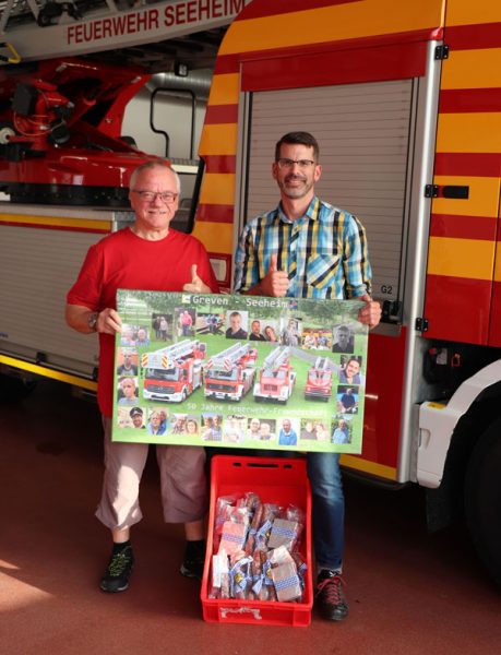 sowie der Seeheimer Wehrführer Jens Ramge (rechts) mit den seitens der Delegation aus Greven anlässlich des Jubiläums überbrachten Aufmerksamkeiten. Foto: Claus Anders