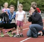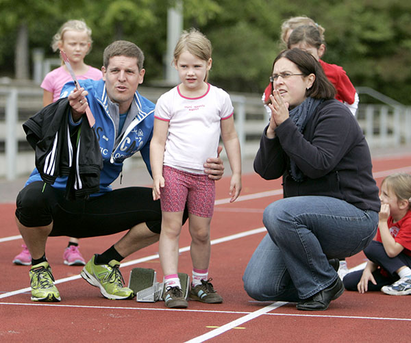 Kurz vor dem Start zu den fünfzig Metern gibt’s für diese kleine Sportlerin die letzten Tipps vom „Mama und Papa Trainer-Duo“. Foto: Stefan Oelsner