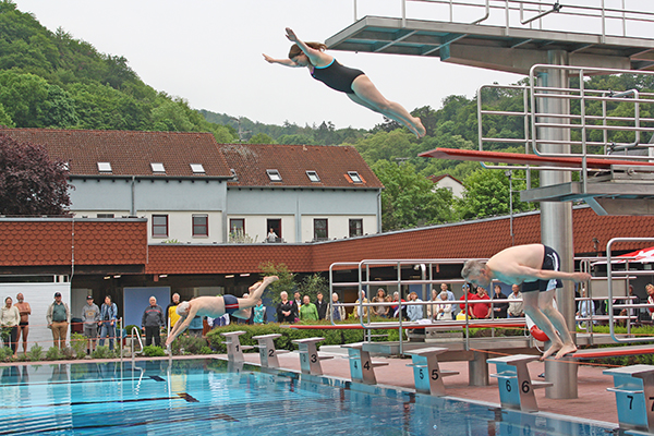 Harald Hoffmann (Schwimmbadverein), Bademeisterin Julia Zimmermann und der Vorsitzende der Gemeindevertretung Hans-Jürgen Wickenhöfer eröffneten die disejährige Frei-badsaison mit einem kühnen Sprung ins Wasser (v.l.n.r.). Foto: pae