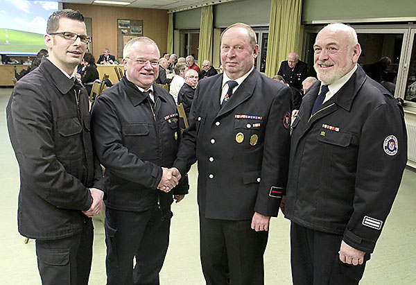Geehrt für 50 Jahre Mitgliedschaft in der Freiwilligen Feuerwehr Seeheim wurde Hans-Jürgen Ramge vom neuen Vorsitzenden der Seeheimer Wehr Robert Zeißler (2.v.li.), dem Ehrenvorsitzenden und bisherigen Vorsitzenden Reinhold Haller (re.) und Wehrführer Jens Ramge (li.).
