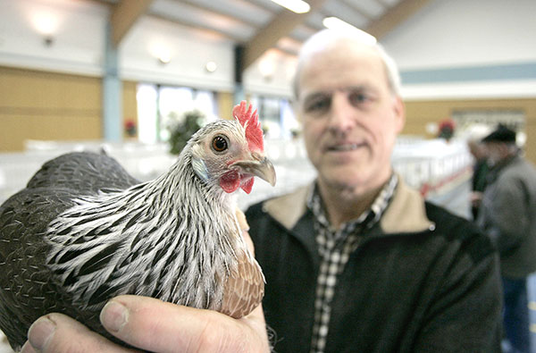 Volker Reimund ist stolz auf sein schön gezeichnetes deutsches Zwerghuhn.