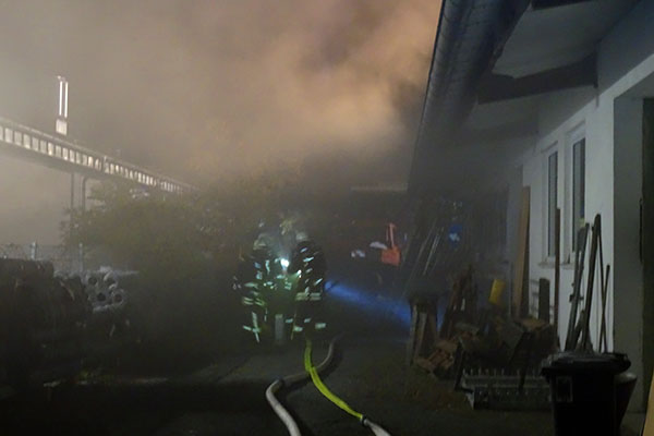 Bei Ankunft der alarmmäßig angerückten Einsatzkräfte drang bereits dichter (Übungs)rauch aus der Halle. Foto: FF Seeheim