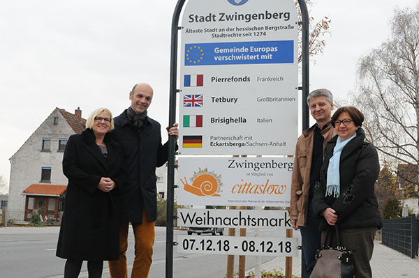 Seit kurzem ist Zwingenberg Mitglied der internationalen „Cittaslow“ Vereinigung. Unser Foto zeigt (v.li.n.re.) Stadtverordnetenvorsteherin Birgit Heitland, Bürgermeister Dr. Holger Habich, Stadtrat Dr. Michael Knecht und Stadträtin Ingrid Germann bei der offiziellen Vorstellung. Foto: Vera Samstag