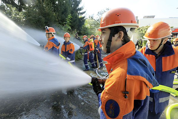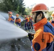 „Oh! Die Schule brennt!“ Viel Löschwasser wurde bei der Feuerwehrübung der Jugendfeuerwehren versprüht. Foto: soe