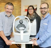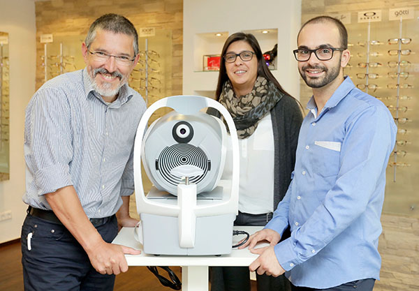 Augenoptikermeister Bernhard Diemer, Augenoptikermeisterin Jutta Stiefel und Augenoptiker Olcay Tekin (v.li.) mit dem neuen Wellenfront-Messgerät. Foto: soe