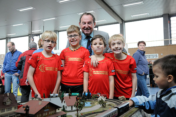 Präsident und Trainer der F-Jugend der Eintracht Zwingenberg Gustav Brücher freut sich mit „seinen Jungs“ über die neuen Trikots. Foto: Eva M. Wicht