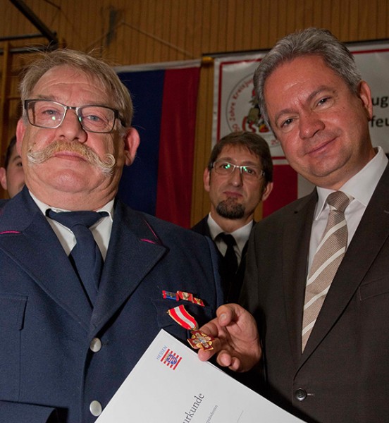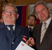 1964 war Jürgen Künz (li.) gerade 12 Jahre alt und eines der Gründungsmitglieder der Zwingenberger Jugendfeuerwehr. Für seine Treue wurde er deshalb von Landrat Matthias Wilkes (re.) mit dem goldenen Brandschutzehrenabzeichen am Bande geehrt. Foto: D. Zengel