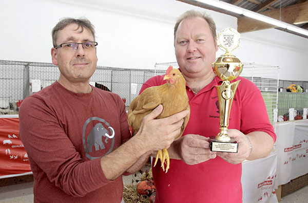 Zum schönsten Tier der Schau wurde das „Zwerg-Plymouth-Rocks“ Huhn von Züchter Heinrich Oßmann (li.) gekührt. Hier mit 1. Vorsitzenden Rainer Klein. Foto: soe